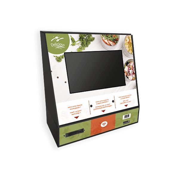 Descargar la ficha técnicaDiseñado para ser montado sobre un soporte VESA, para colocarse fácilmente en un mostrador sin ocupar espacio, el Frame retoma el principio del Kiosk con lector de tarjetas en el frontal, lector NFC y una pantalla táctil de 13 pulgadas.